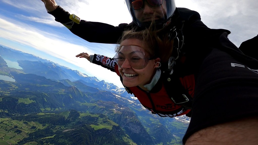 Once we were up to the correct altitude, we prepared to jump. Thankfully, I was the first out the plane. There was no count-down just a push and a long fall. The first 5 seconds were scary and then the rest you just had to embrace it and have fun. It was a blast and I loved every minute (after the plane and the first couple seconds of the fall).