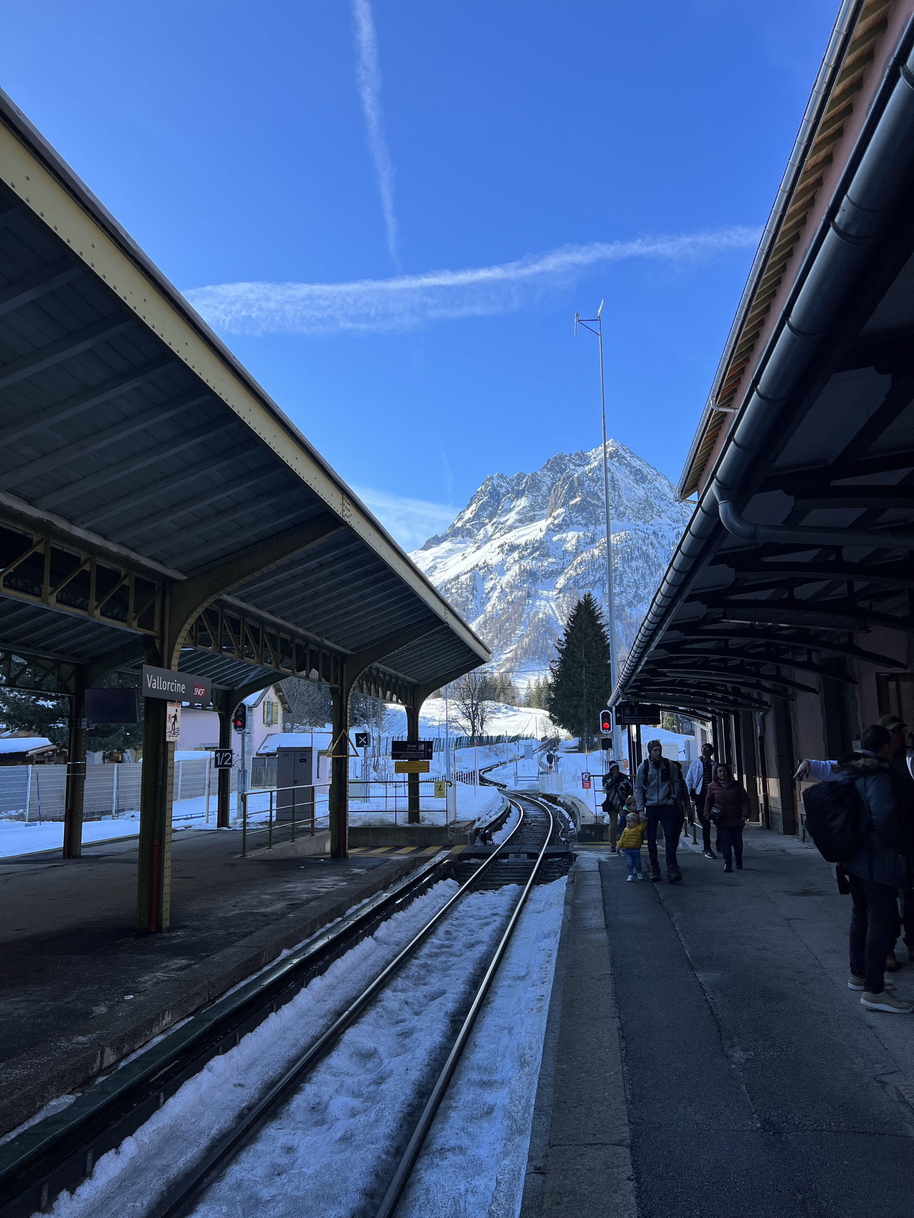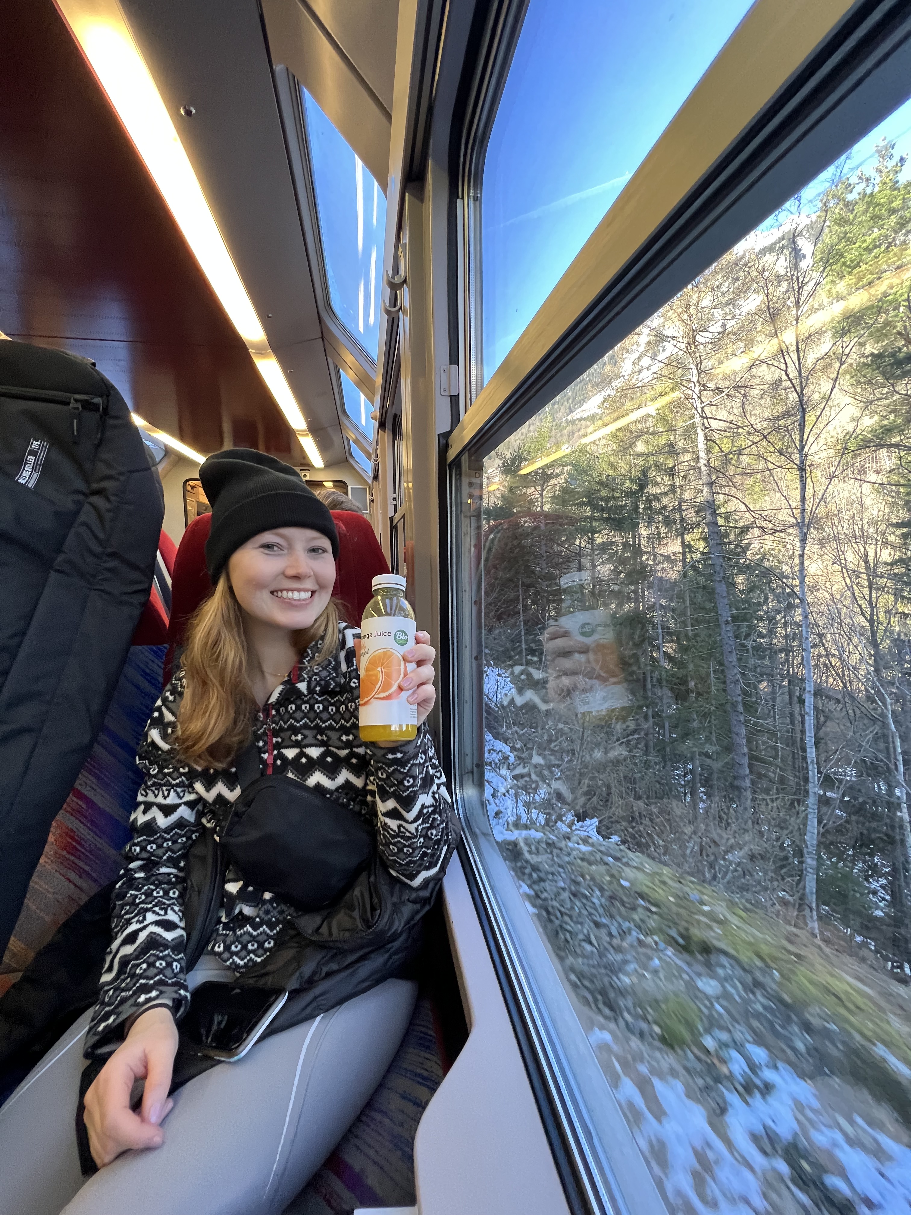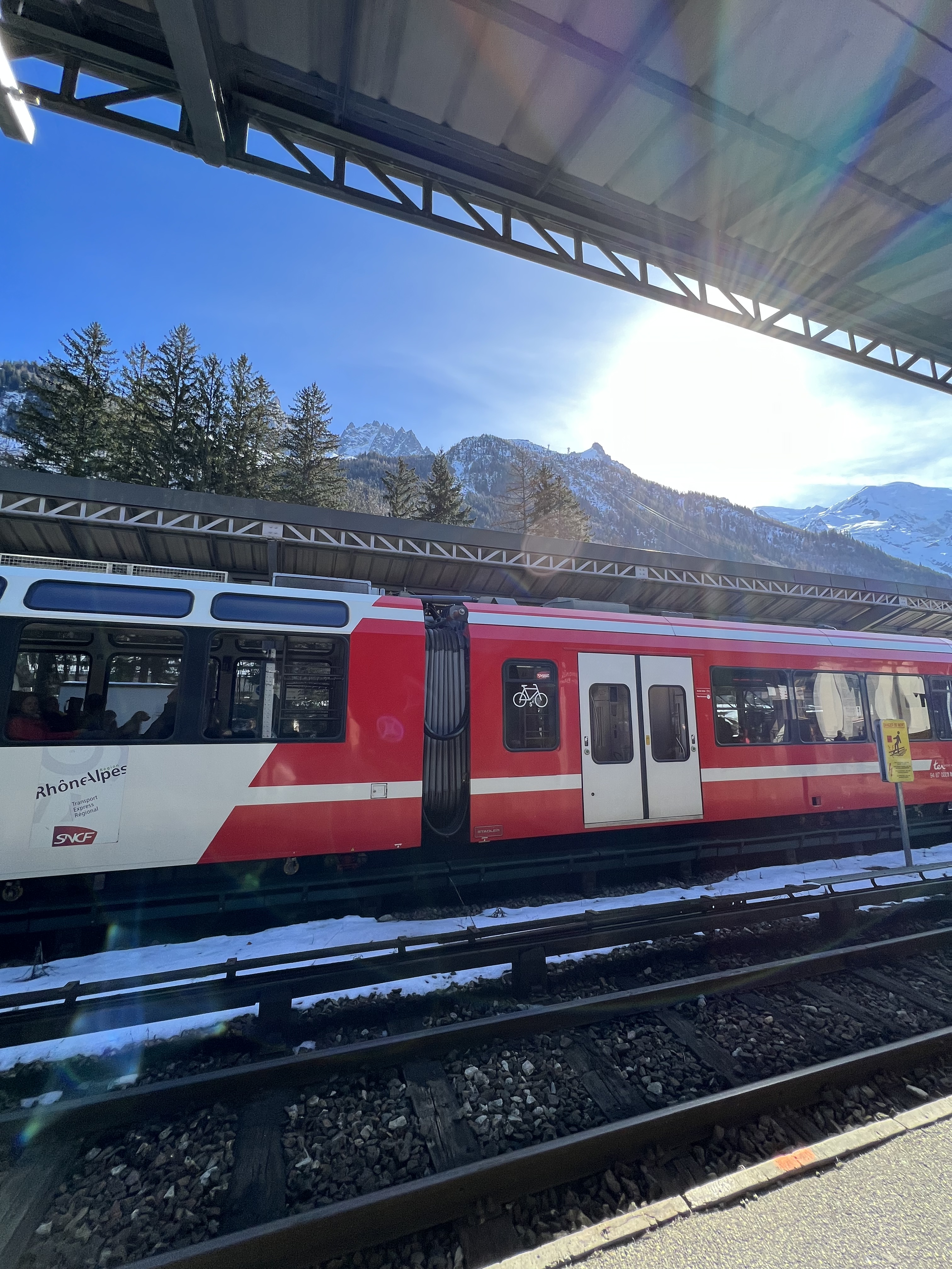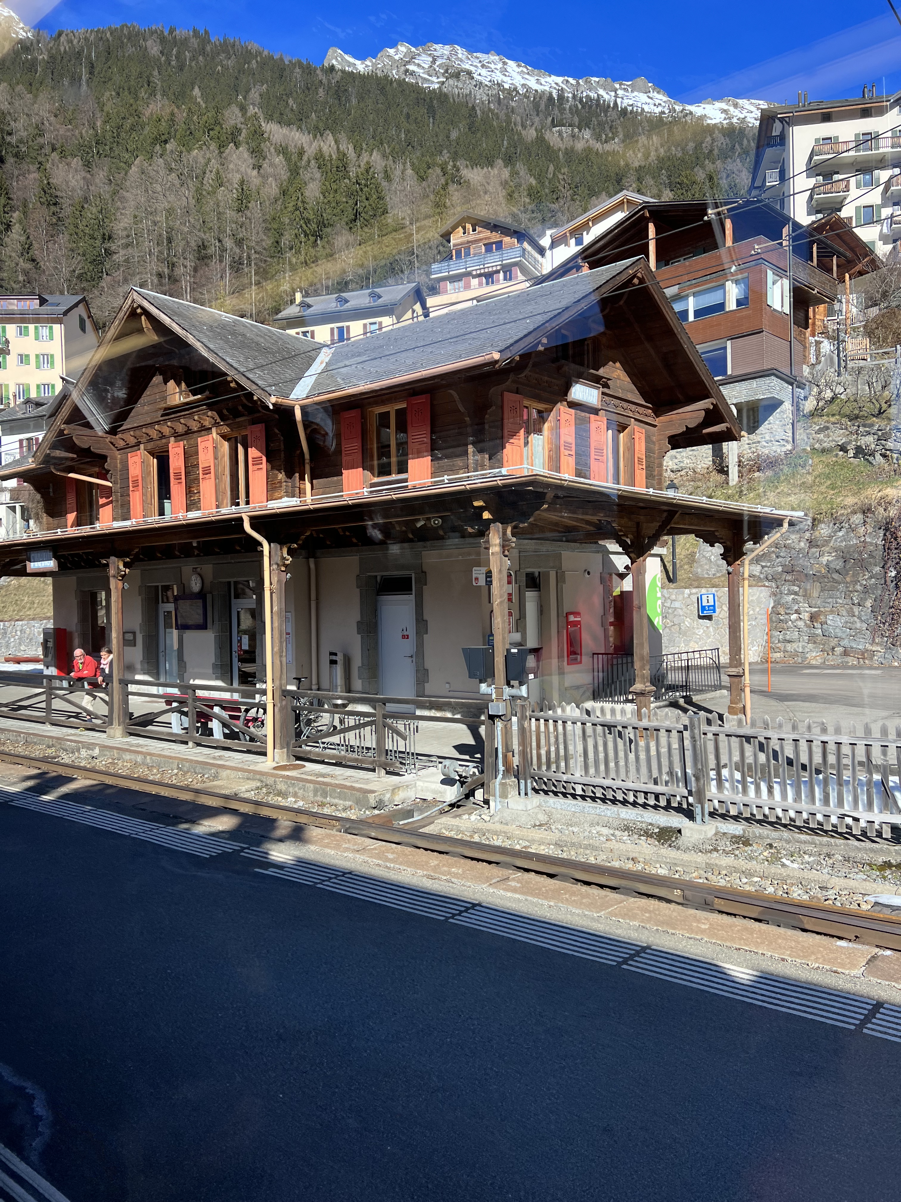 Our connections on this journey were very short (as in somewhere 8 minutes while others were a max of 15 if we made every train on our first try that was). The first train was from Zurich to Visp and the longest train on our journey at right around 2 hours. The first connect was 4 minutes, causing a bit a stress because we had to get our ski bags (while besides mine cause #itwaslost) off the train, find the right platform, and get back on the next train all within that 4-minute time span. Luckily, the train station only had 6 platforms so we were able to successfully complete the first transfer. The next train was quick at around 40 minutes from Visp to Martigny. This train, we spent the majority of the trip staring out into the beautiful Swiss valley and taking in all the views. The next connection wasn’t quite as stressful because we had 15 minutes and the train arrived earlier, so we ended up with 20. The train station in Martingny also only had 4 platforms, so it was a very easy transfer. We got off the train found a convenience store, and got some baguettes, croissants, and coffee before heading to the next platform to hop on our third train of the trip. The third train was also about an hour long. This train we spent the entire time staring out the window at the amazing mountain views. They were beautiful and the train practically went straight up the mountain. Sadly, our train was running late, so we missed our next 2-minute transfer and had to wait an hour in Vallorcine for the last train to come. We explored outside a little, however, since most of us had our ski bags we didn’t travel very far as we didn’t want to miss the next train and wait another hour. After an hour of waiting, we got on the final train to Chamonix Mont-Blanc. On this train the sights were immaculate and we were all in ahh so excited for what the next night entailed.