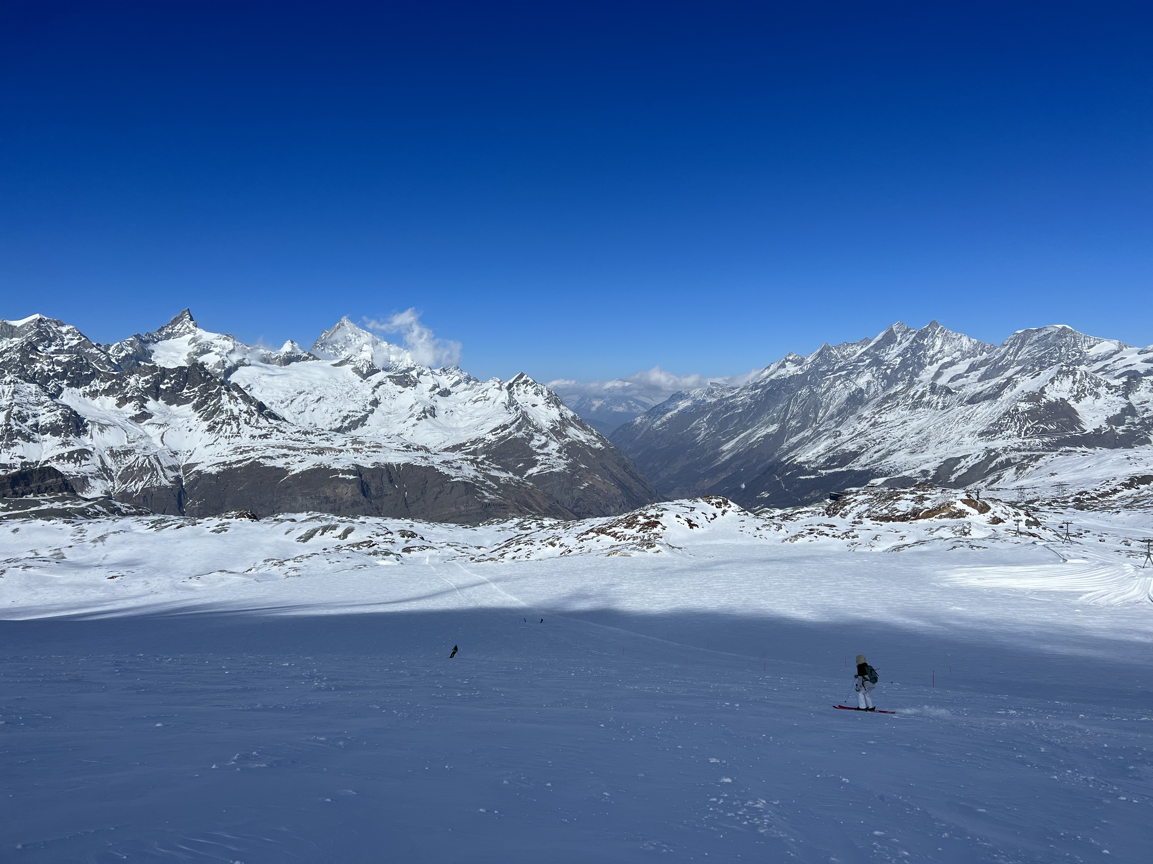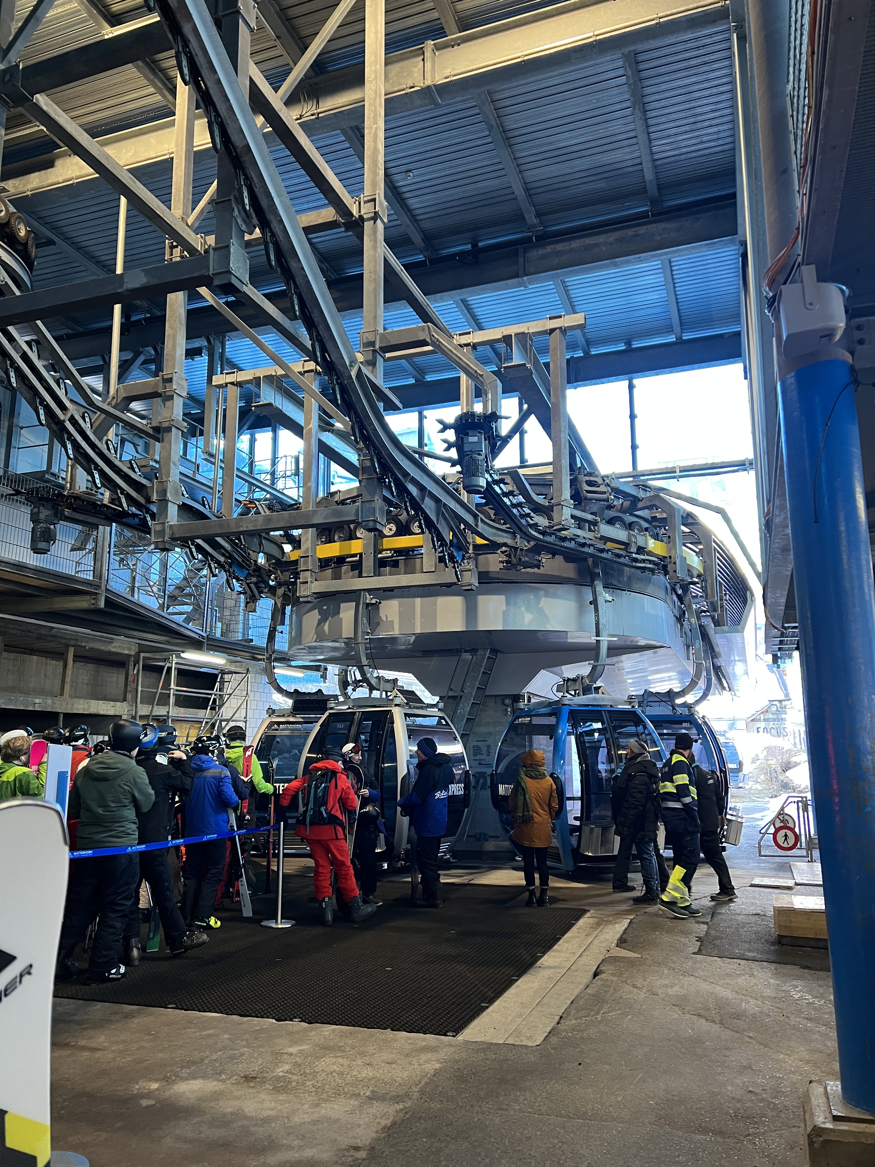 The journey started off great, we had a little over a half-mile walk to the base of the gondola. It was totally fine and we made it with no complications. We then went to the ticket booth and traded our IKON passes for our Zermatt mountain passes. Again, no issues here. Once we had our passes and were at the base, we headed to get in line at the gondola – we had arrived 15 minutes early to the base, so we could get in a full day of skiing. This is where our journey began. The gondola was having some technical difficulties, as it would get stuck every time it came around the bend. This meant that the line moved very slowly, but the mechanical engineers of Switzerland were quick for a resolution. It was a funny time and after 45ish minutes we made it on and were on our way up. The views were absolutely immaculate and got us hyped for the day to come.
