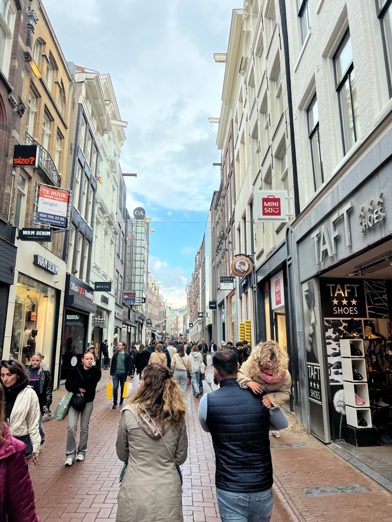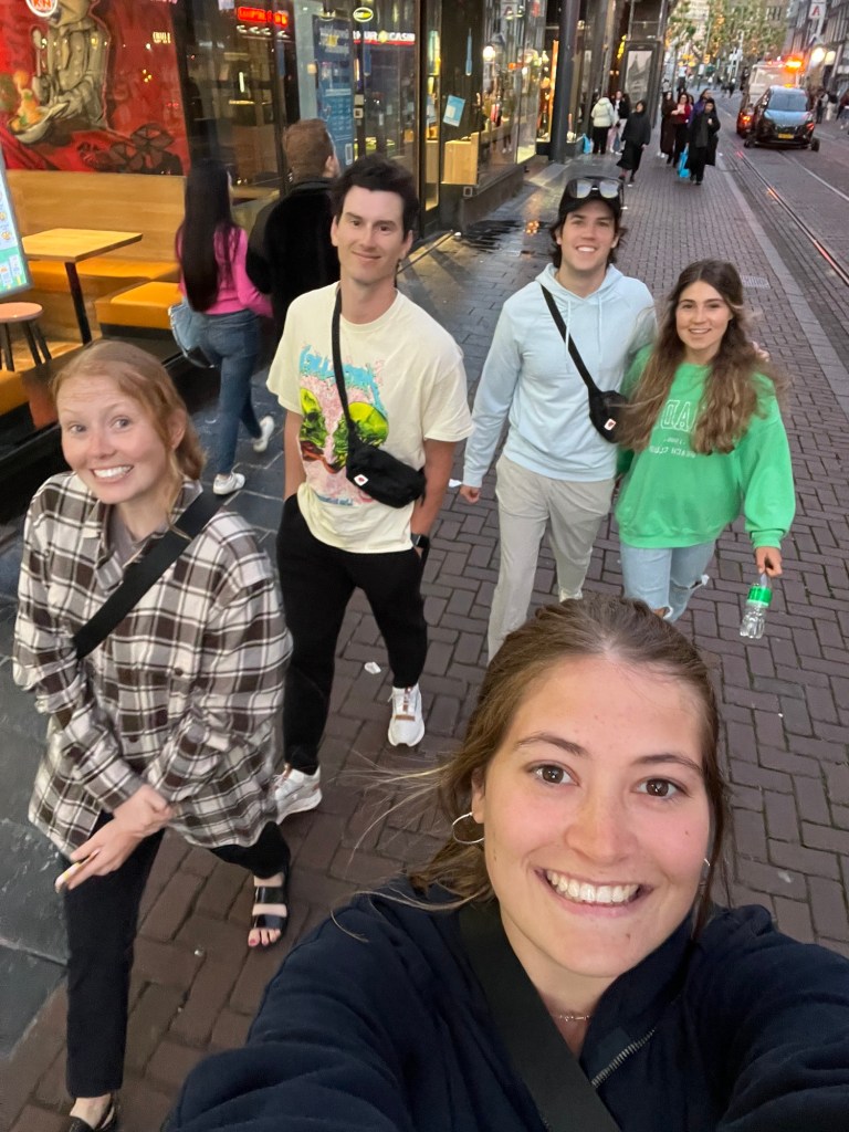 I had told everyone back at the hotel to bring a rain coat before we left but no one followed my lead. We started walking towards a pancake restaurant to get some food as we were hungry from traveling earlier in the day. As soon as we walked outside it started pouring rain, and only I had brought a rain coat, so we ran through the streets of Amsterdam to find the restaurant. Carly was directing us and we missed a couple of turns before finally finding the place; however, the place was cash only and we had not stopped at an ATM yet. We then left the place and found a nearby coffee shop.