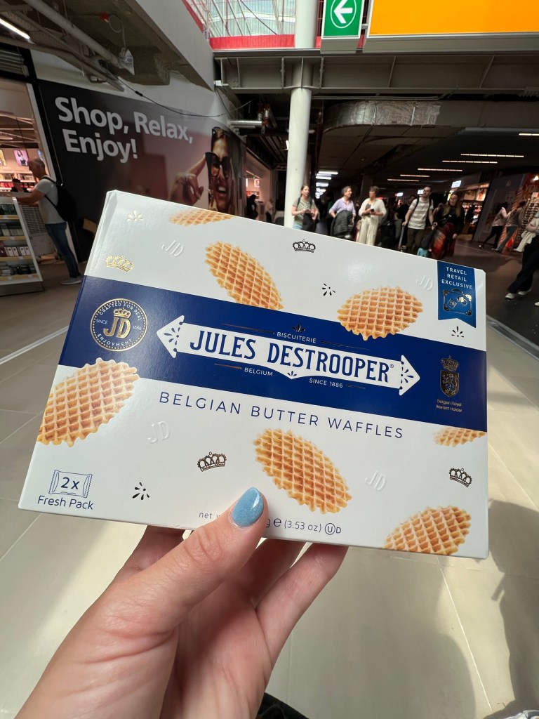 We grabbed our bags and off we went to the central train station. Again, it was a bit challenging to drag the bags across the street because of all the cobble stone roads. We got to the train station and then quickly arrived at the airport. We checked our bag and headed to airport security. Once we were through, we found a little food court to grab food before heading on our flight. We arrived to our gate at the perfect time as they were just starting to board when we arrived.