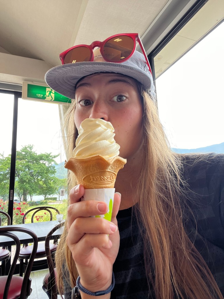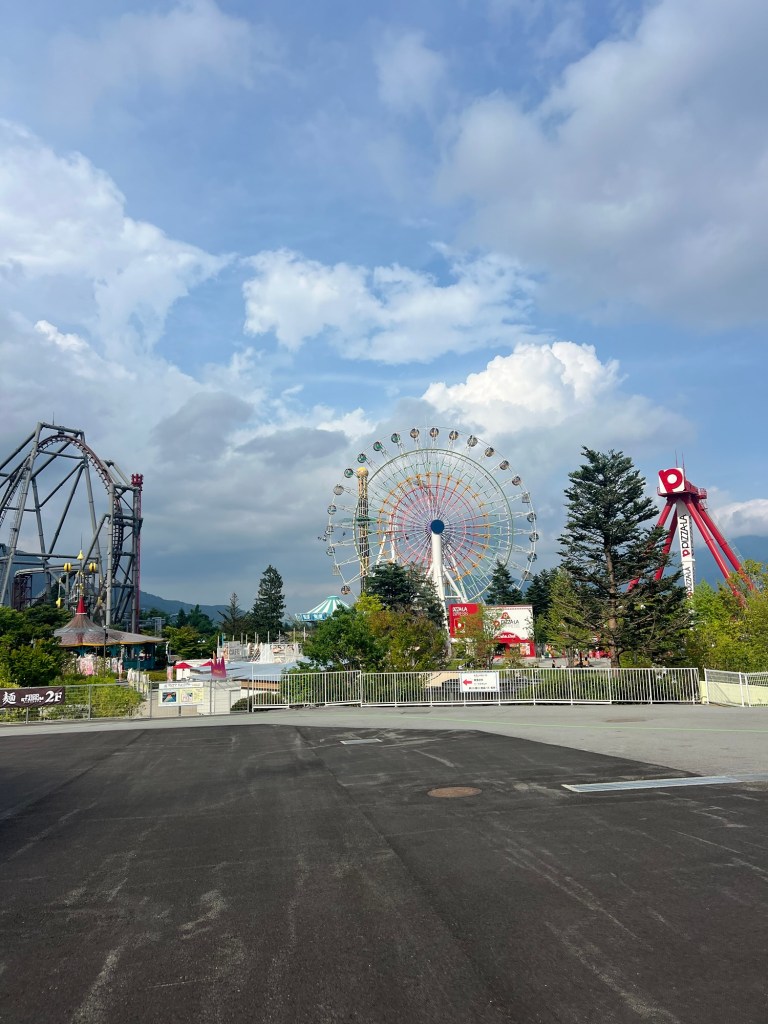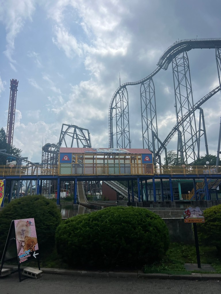 We (Claire, Laura, Ashley, and I) all tried to find a place to get massages, but every place was book the rest of the day, so we pivoted and went to the park by the lake instead. It was extremely hot, so we quickly found a place to get ice cream inside. We sat, chatted, and hung out until the boys arrived. Once they got there, we decided on our next plan which was to try to check-in to the hotel and then go to the nearby amusement park – Fuji0-Q Highland.